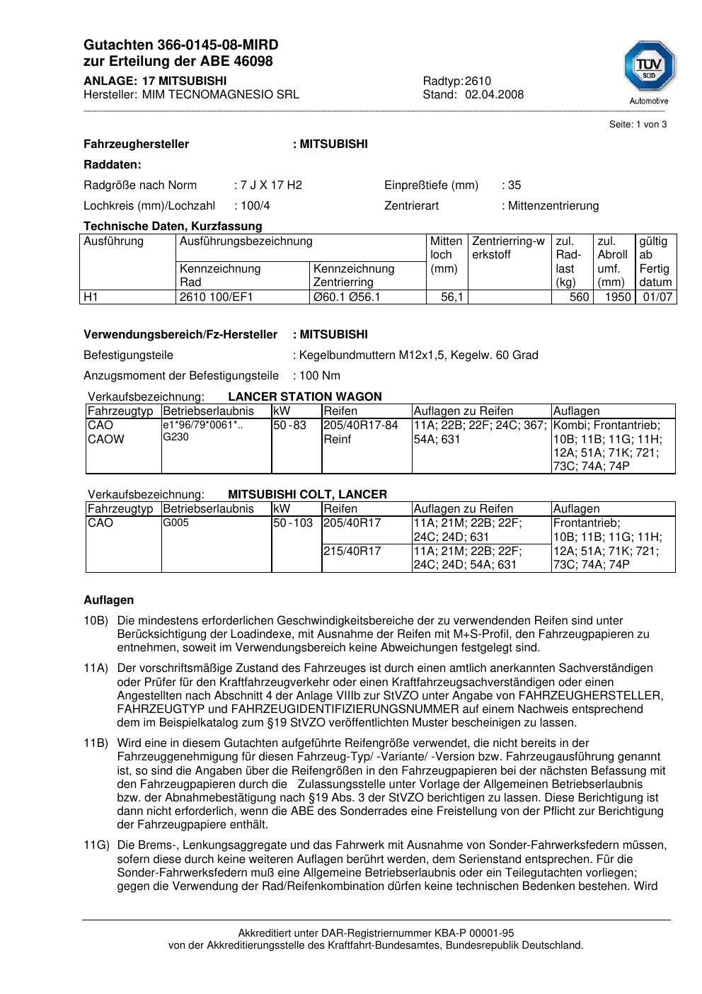 Dieses Gutachten (abe) bezieht sich auf die Alufelge unknown 2610 in der Ausführung ET 0, Mittenloch 0 mm (KBA 46098). Im PDF findest du typischerweise zulässige Reifengrößen, Auflagen/Anbauhinweise und – je nach Dokument – Hinweise zur Eintragung.