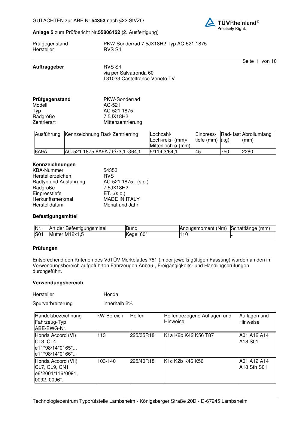 Dieses Gutachten (abe) bezieht sich auf die Alufelge unknown AC-521 1 875 in der Ausführung ET 0, Mittenloch 0 mm (KBA 54353). Im PDF findest du typischerweise zulässige Reifengrößen, Auflagen/Anbauhinweise und – je nach Dokument – Hinweise zur Eintragung.