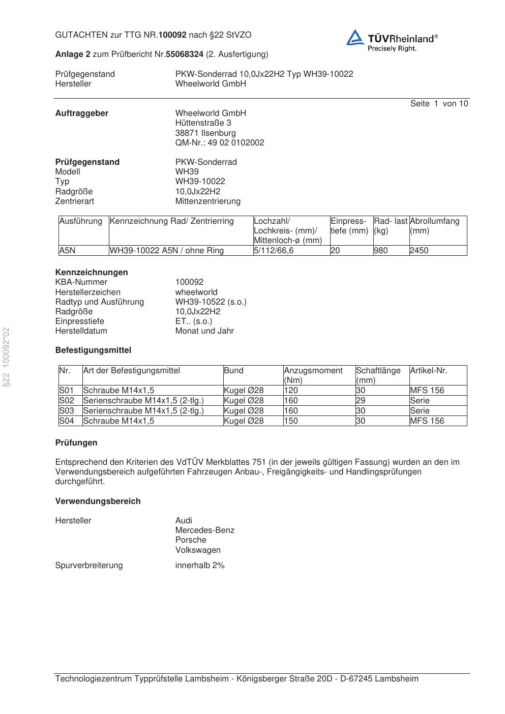 Felgengutachten / teilegutachten für Alufelgen Wheelworld WH39-10022 (ET 0, Mittenloch 0 mm) (Zertifikatsnummer 100092). Hier kostenlos als PDF herunterladen. Der Download-Link ist 24 Stunden gültig und kann bis zu zwei Mal verwendet werden.