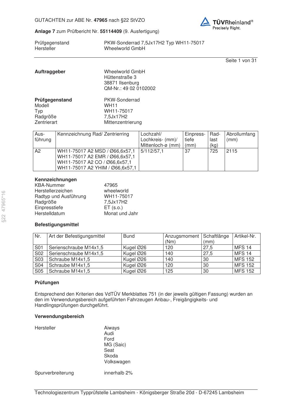 Dieses Gutachten (abe) bezieht sich auf die Alufelge Wheelworld GmbH WH11-75017 in der Ausführung ET 0, Mittenloch 0 mm (KBA 47965). Im PDF findest du typischerweise zulässige Reifengrößen, Auflagen/Anbauhinweise und – je nach Dokument – Hinweise zur Eintragung.