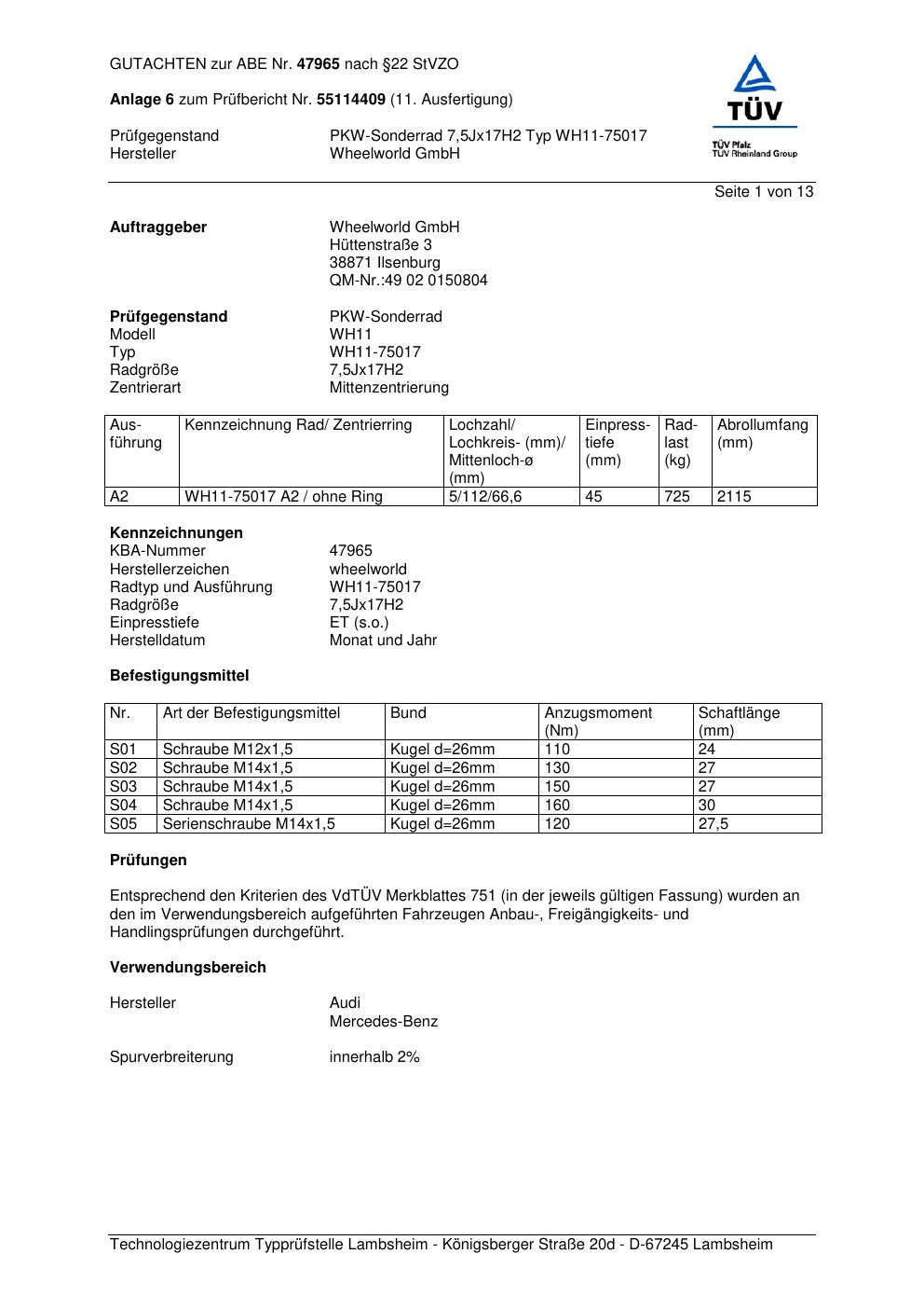 Dieses Gutachten (abe) bezieht sich auf die Alufelge Wheelworld GmbH WH11-750 17 in der Ausführung ET 0, Mittenloch 0 mm (KBA 47965). Im PDF findest du typischerweise zulässige Reifengrößen, Auflagen/Anbauhinweise und – je nach Dokument – Hinweise zur Eintragung.