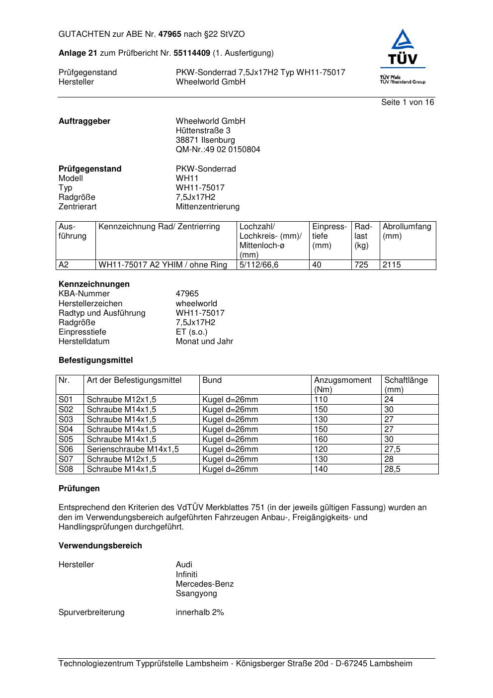 Dieses Gutachten (abe) bezieht sich auf die Alufelge Wheelworld GmbH WH11-75017 in der Ausführung ET 0, Mittenloch 0 mm (KBA 47965). Im PDF findest du typischerweise zulässige Reifengrößen, Auflagen/Anbauhinweise und – je nach Dokument – Hinweise zur Eintragung.
