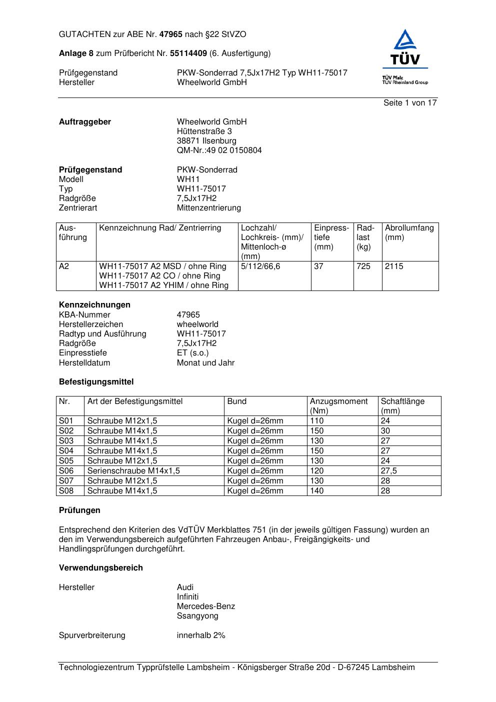 Dieses Gutachten (abe) bezieht sich auf die Alufelge Wheelworld GmbH WH11-75017 in der Ausführung ET 0, Mittenloch 0 mm (KBA 47965). Im PDF findest du typischerweise zulässige Reifengrößen, Auflagen/Anbauhinweise und – je nach Dokument – Hinweise zur Eintragung.