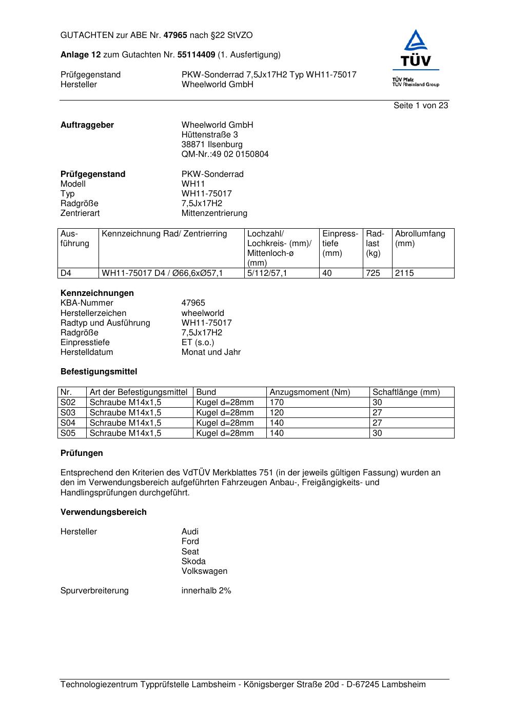 Dieses Gutachten (abe) bezieht sich auf die Alufelge Wheelworld GmbH WH11-750 17 in der Ausführung ET 0, Mittenloch 0 mm (KBA 47965). Im PDF findest du typischerweise zulässige Reifengrößen, Auflagen/Anbauhinweise und – je nach Dokument – Hinweise zur Eintragung.