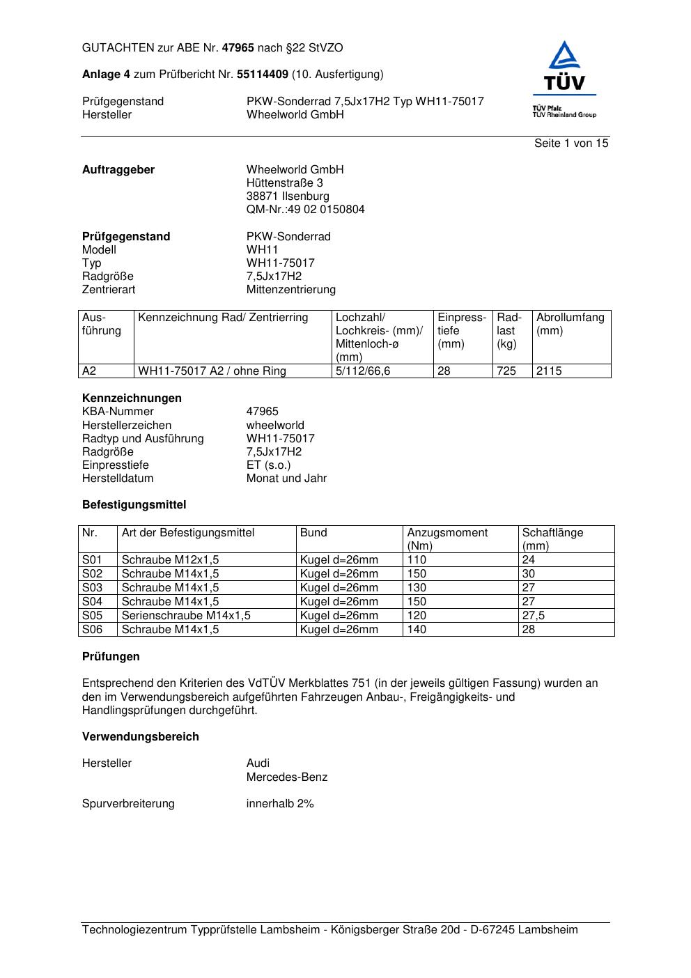 Dieses Gutachten (abe) bezieht sich auf die Alufelge Wheelworld GmbH WH11-75017 in der Ausführung ET 0, Mittenloch 0 mm (KBA 47965). Im PDF findest du typischerweise zulässige Reifengrößen, Auflagen/Anbauhinweise und – je nach Dokument – Hinweise zur Eintragung.