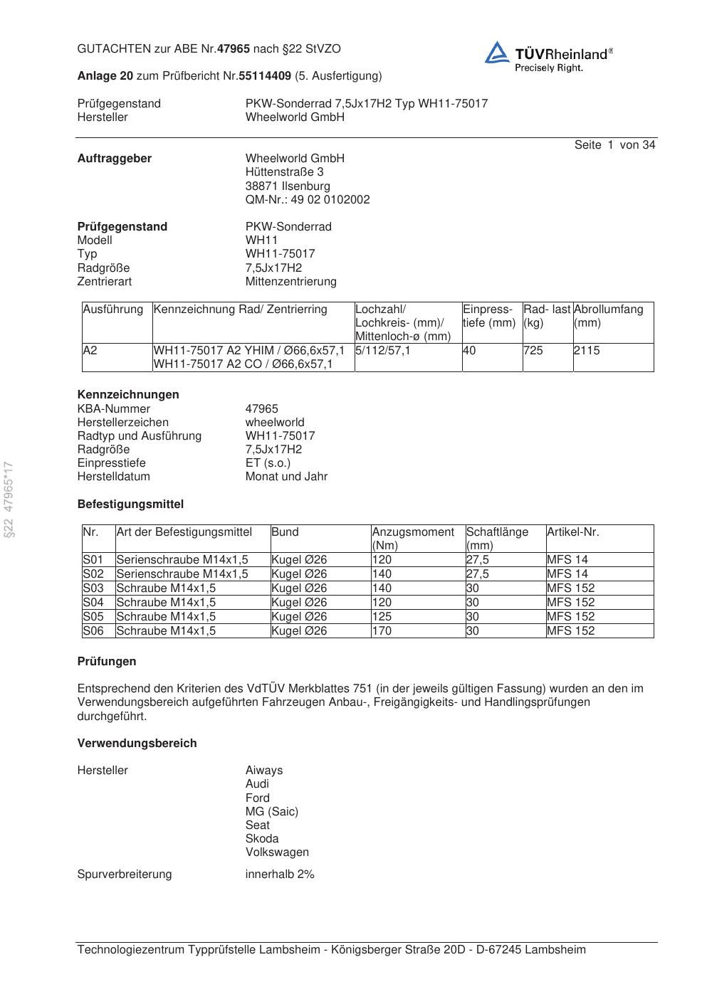 Dieses Gutachten (abe) bezieht sich auf die Alufelge Wheelworld WH11-75017 in der Ausführung ET 0, Mittenloch 0 mm (KBA 47965). Im PDF findest du typischerweise zulässige Reifengrößen, Auflagen/Anbauhinweise und – je nach Dokument – Hinweise zur Eintragung.