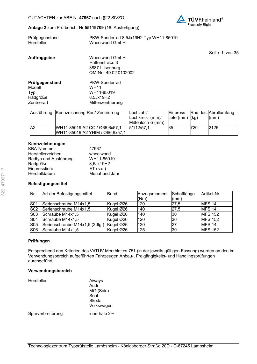 Dieses Gutachten (abe) bezieht sich auf die Alufelge Wheelworld GmbH WH11-85019 in der Ausführung ET 0, Mittenloch 0 mm (KBA 47967). Im PDF findest du typischerweise zulässige Reifengrößen, Auflagen/Anbauhinweise und – je nach Dokument – Hinweise zur Eintragung.