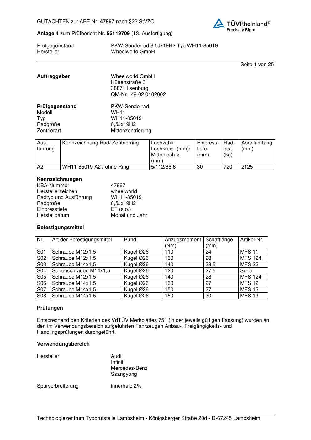 Dieses Gutachten (abe) bezieht sich auf die Alufelge Wheelworld GmbH WH11-850 19 in der Ausführung ET 0, Mittenloch 0 mm (KBA 47967). Im PDF findest du typischerweise zulässige Reifengrößen, Auflagen/Anbauhinweise und – je nach Dokument – Hinweise zur Eintragung.