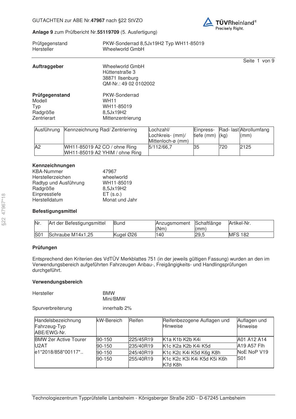 Dieses Gutachten (abe) bezieht sich auf die Alufelge Wheelworld GmbH WH11-85019 in der Ausführung ET 0, Mittenloch 0 mm (KBA 47967). Im PDF findest du typischerweise zulässige Reifengrößen, Auflagen/Anbauhinweise und – je nach Dokument – Hinweise zur Eintragung.