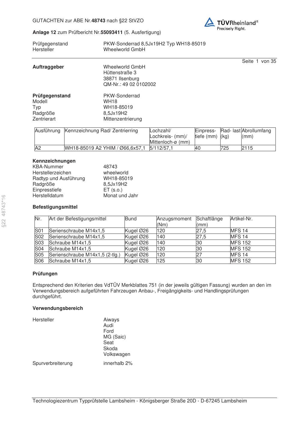 Dieses Gutachten (abe) bezieht sich auf die Alufelge Wheelworld GmbH WH18-85019 in der Ausführung ET 0, Mittenloch 0 mm (KBA 48743). Im PDF findest du typischerweise zulässige Reifengrößen, Auflagen/Anbauhinweise und – je nach Dokument – Hinweise zur Eintragung.