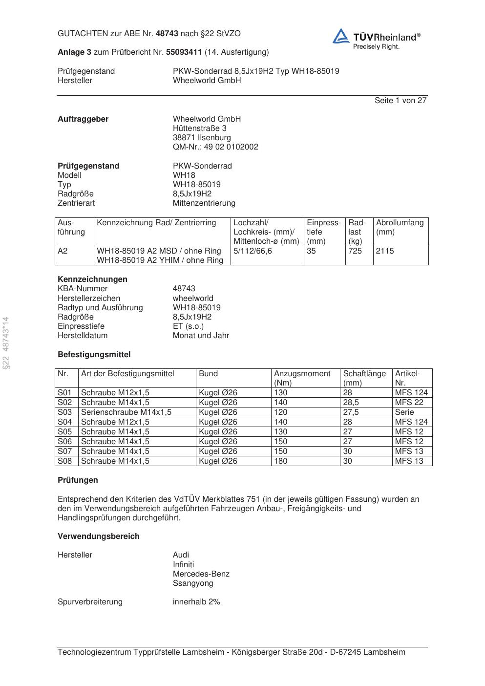 Felgengutachten / abe für Alufelgen Wheelworld GmbH WH18-85019 (ET 0, Mittenloch 0 mm) mit KBA 48743 (Zertifikatsnummer 48743). Hier kostenlos als PDF herunterladen. Der Download-Link ist 24 Stunden gültig und kann bis zu zwei Mal verwendet werden.
