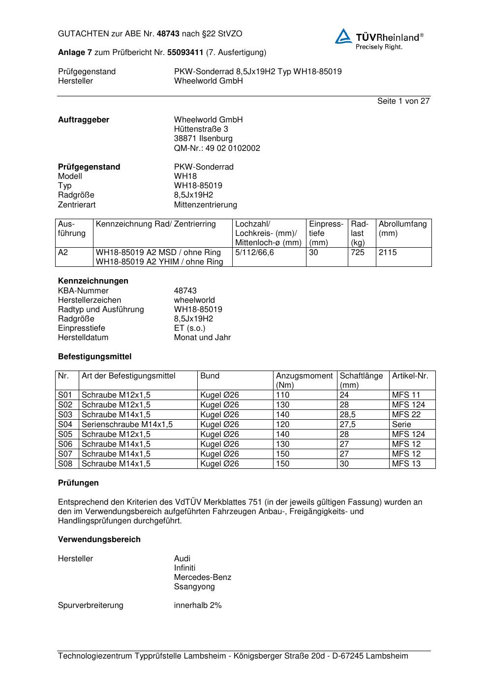 Felgengutachten / abe für Alufelgen Wheelworld GmbH WH18-85019 (ET 0, Mittenloch 0 mm) mit KBA 48743 (Zertifikatsnummer 48743). Hier kostenlos als PDF herunterladen. Der Download-Link ist 24 Stunden gültig und kann bis zu zwei Mal verwendet werden.