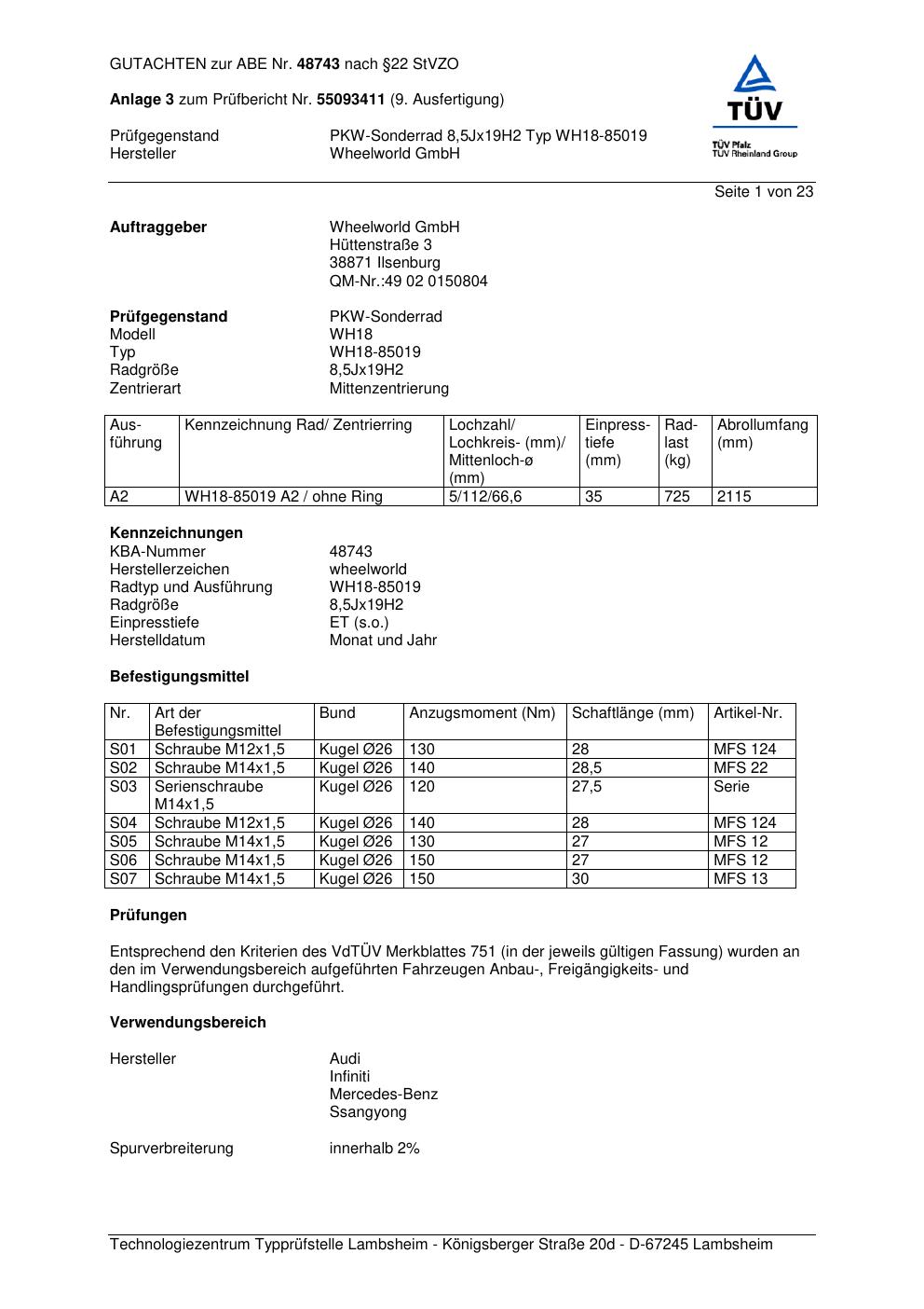 Dieses Gutachten (abe) bezieht sich auf die Alufelge Wheelworld GmbH WH18-850 19 in der Ausführung ET 0, Mittenloch 0 mm (KBA 48743). Im PDF findest du typischerweise zulässige Reifengrößen, Auflagen/Anbauhinweise und – je nach Dokument – Hinweise zur Eintragung.