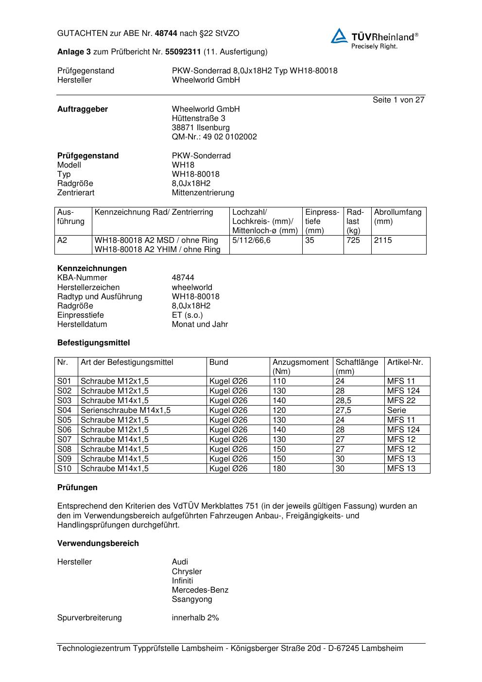 Dieses Gutachten (abe) bezieht sich auf die Alufelge Wheelworld WH18-80018 in der Ausführung ET 0, Mittenloch 0 mm (KBA 48744). Im PDF findest du typischerweise zulässige Reifengrößen, Auflagen/Anbauhinweise und – je nach Dokument – Hinweise zur Eintragung.