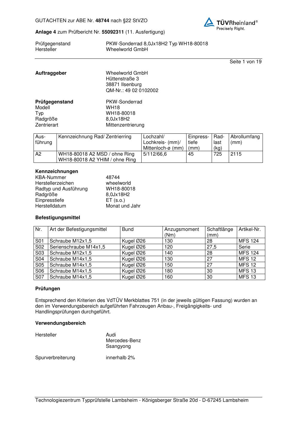 Dieses Gutachten (abe) bezieht sich auf die Alufelge Wheelworld WH18-800 18 in der Ausführung ET 0, Mittenloch 0 mm (KBA 48744). Im PDF findest du typischerweise zulässige Reifengrößen, Auflagen/Anbauhinweise und – je nach Dokument – Hinweise zur Eintragung.