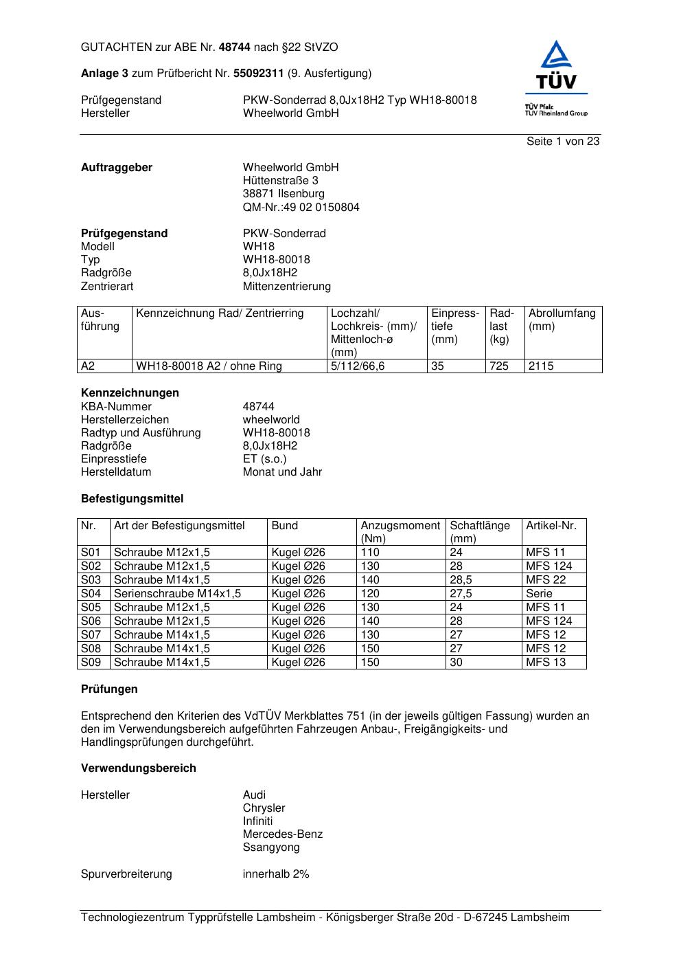 Dieses Gutachten (abe) bezieht sich auf die Alufelge Wheelworld WH18-800 18 in der Ausführung ET 0, Mittenloch 0 mm (KBA 48744). Im PDF findest du typischerweise zulässige Reifengrößen, Auflagen/Anbauhinweise und – je nach Dokument – Hinweise zur Eintragung.