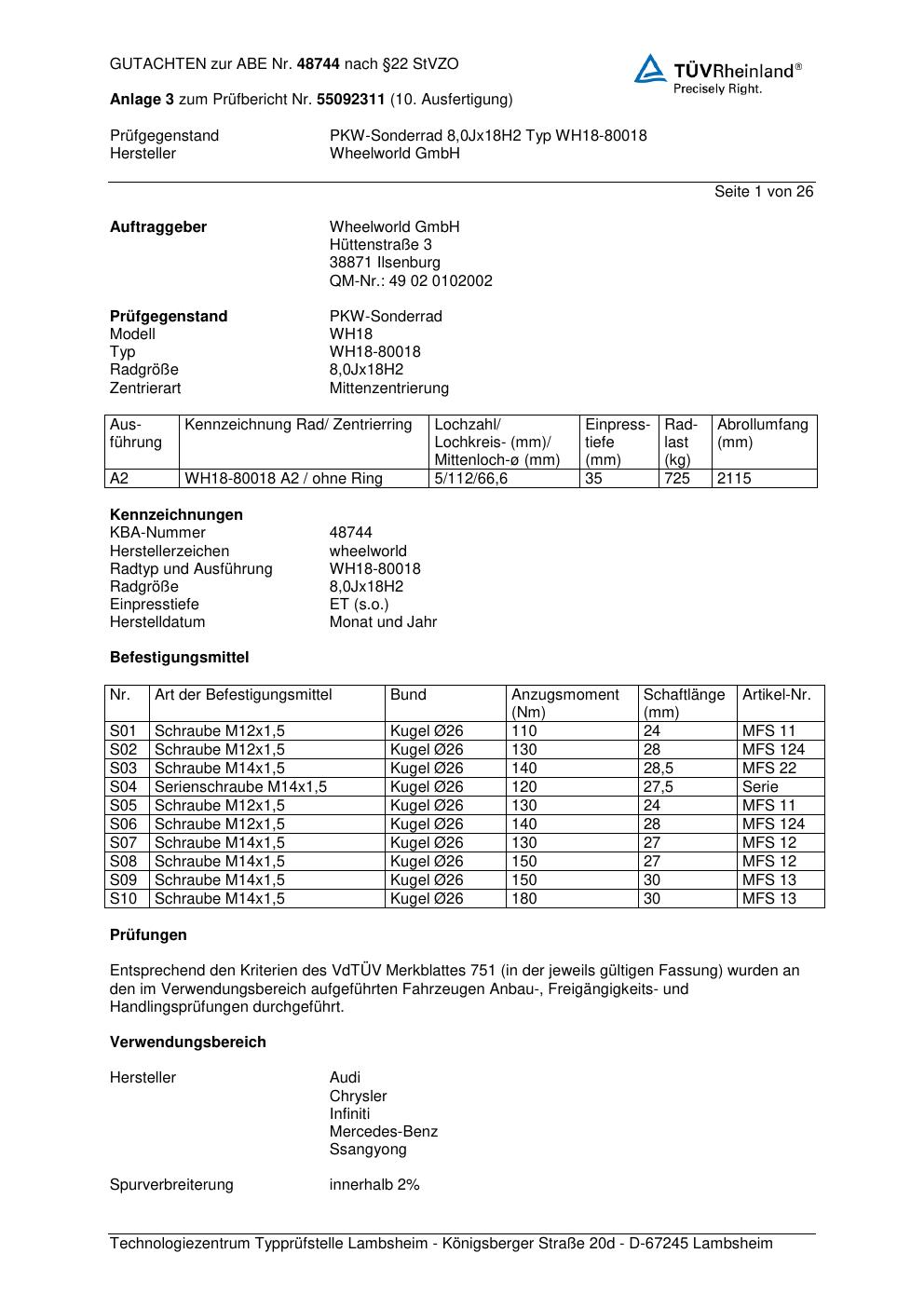 Dieses Gutachten (abe) bezieht sich auf die Alufelge Wheelworld WH18-800 18 in der Ausführung ET 0, Mittenloch 0 mm (KBA 48744). Im PDF findest du typischerweise zulässige Reifengrößen, Auflagen/Anbauhinweise und – je nach Dokument – Hinweise zur Eintragung.