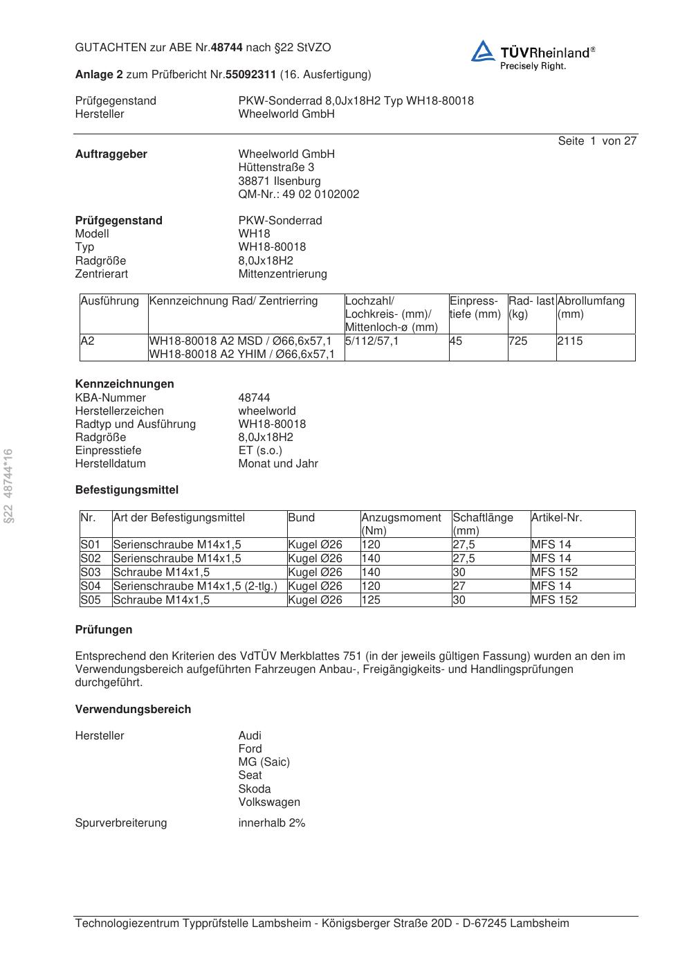 Dieses Gutachten (abe) bezieht sich auf die Alufelge Wheelworld WH18-80018 in der Ausführung ET 0, Mittenloch 0 mm (KBA 48744). Im PDF findest du typischerweise zulässige Reifengrößen, Auflagen/Anbauhinweise und – je nach Dokument – Hinweise zur Eintragung.