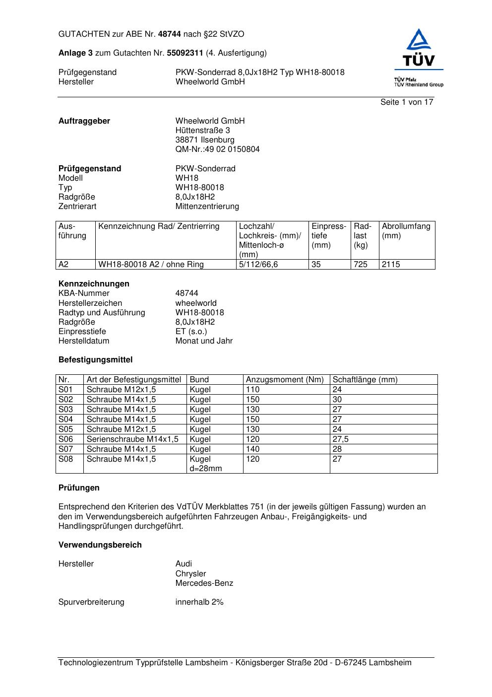 Dieses Gutachten (abe) bezieht sich auf die Alufelge Wheelworld WH18-80018 in der Ausführung ET 0, Mittenloch 0 mm (KBA 48744). Im PDF findest du typischerweise zulässige Reifengrößen, Auflagen/Anbauhinweise und – je nach Dokument – Hinweise zur Eintragung.