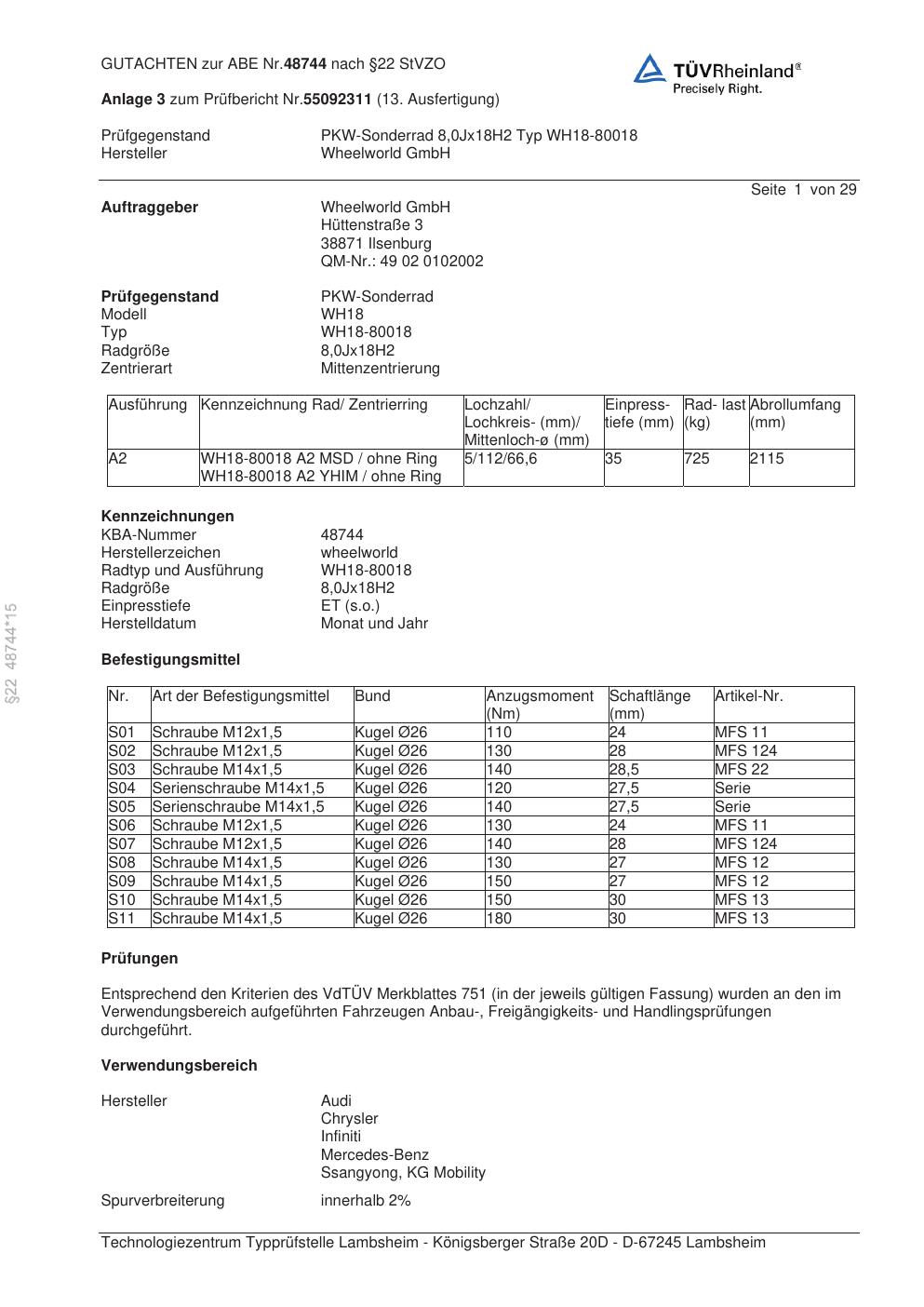 Dieses Gutachten (abe) bezieht sich auf die Alufelge Wheelworld WH18-80018 in der Ausführung ET 0, Mittenloch 0 mm (KBA 48744). Im PDF findest du typischerweise zulässige Reifengrößen, Auflagen/Anbauhinweise und – je nach Dokument – Hinweise zur Eintragung.