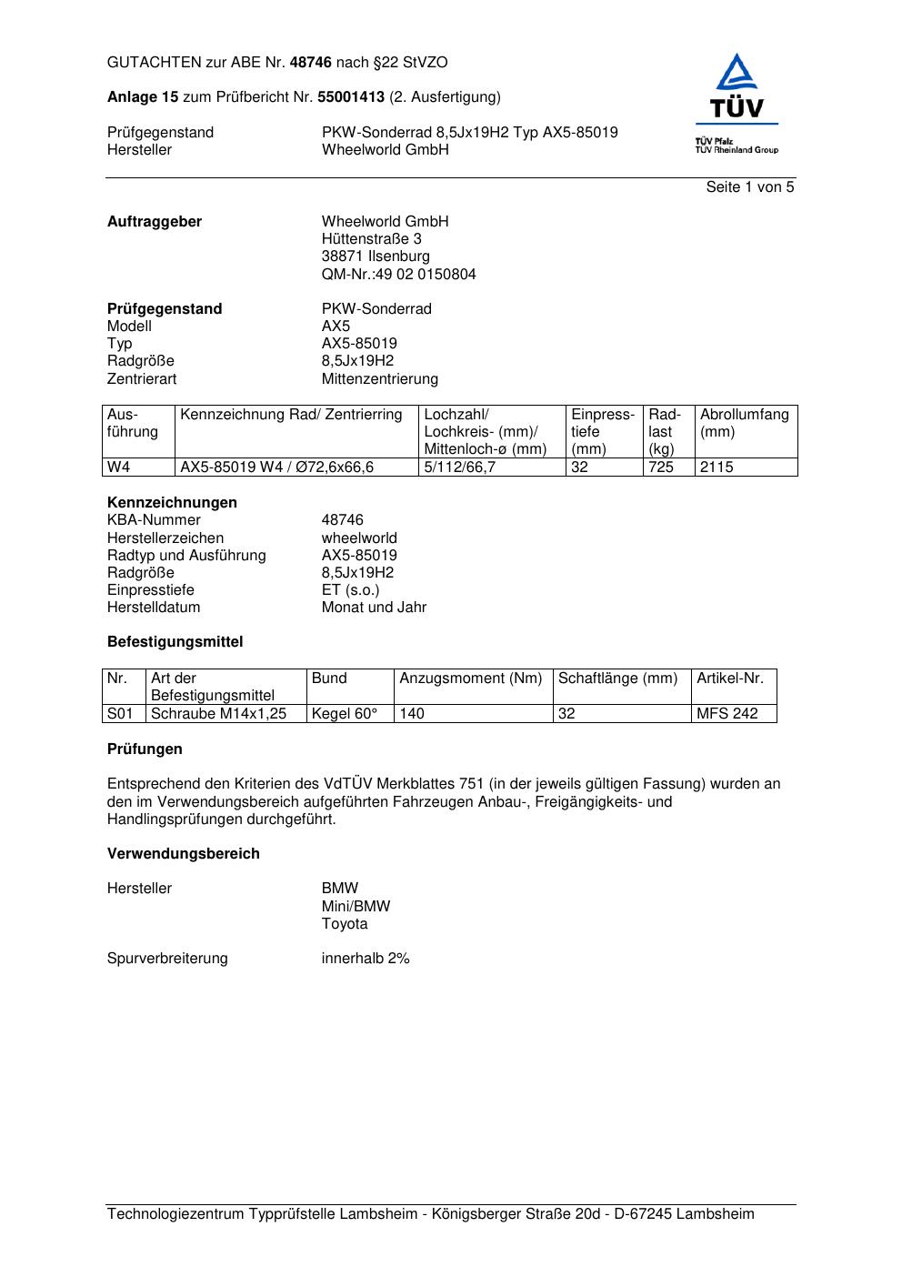 Dieses Gutachten (abe) bezieht sich auf die Alufelge Wheelworld GmbH AX5-85019 in der Ausführung ET 0, Mittenloch 0 mm (KBA 48746). Im PDF findest du typischerweise zulässige Reifengrößen, Auflagen/Anbauhinweise und – je nach Dokument – Hinweise zur Eintragung.
