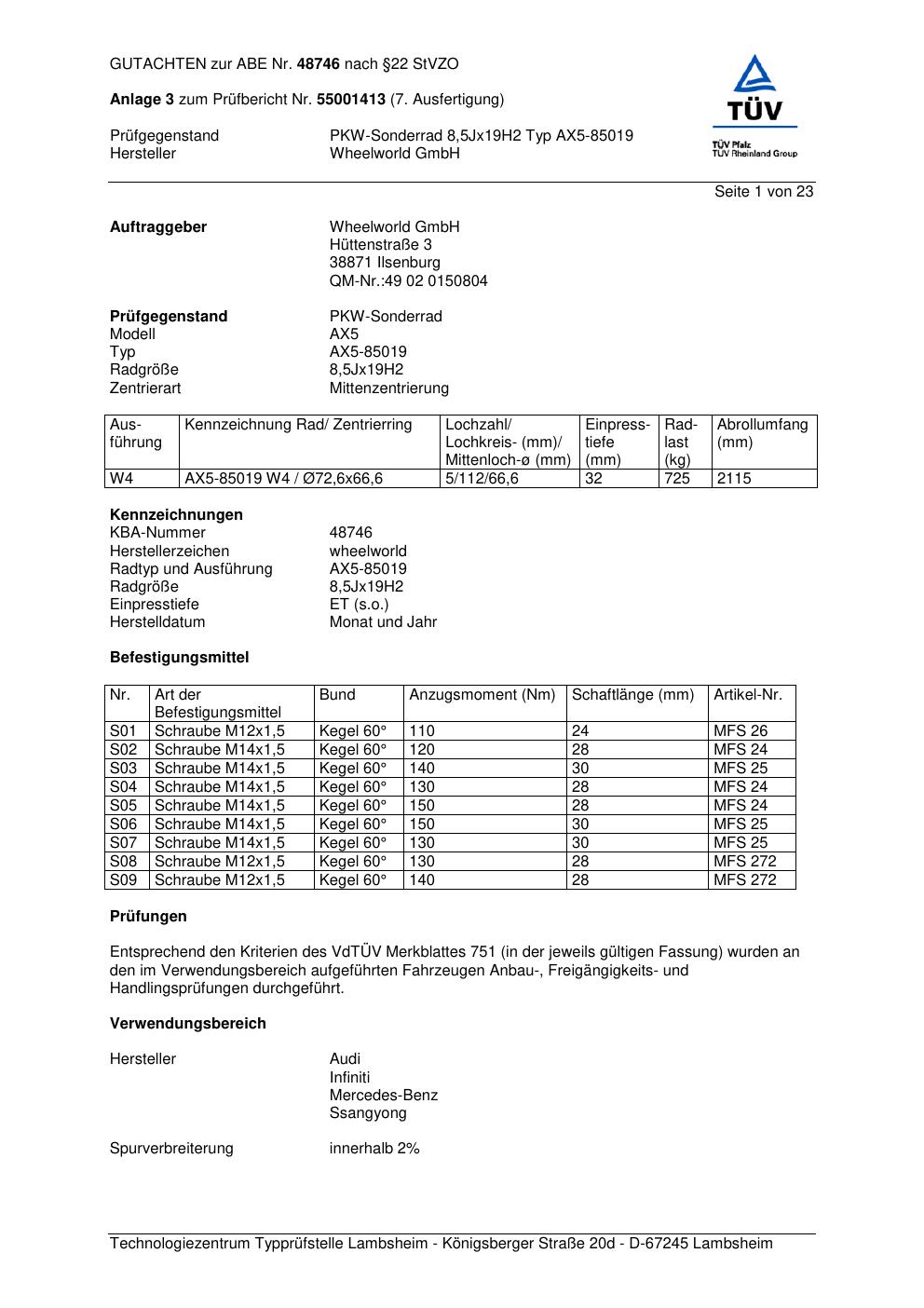 Dieses Gutachten (abe) bezieht sich auf die Alufelge Wheelworld GmbH AX5-85019 in der Ausführung ET 0, Mittenloch 0 mm (KBA 48746). Im PDF findest du typischerweise zulässige Reifengrößen, Auflagen/Anbauhinweise und – je nach Dokument – Hinweise zur Eintragung.