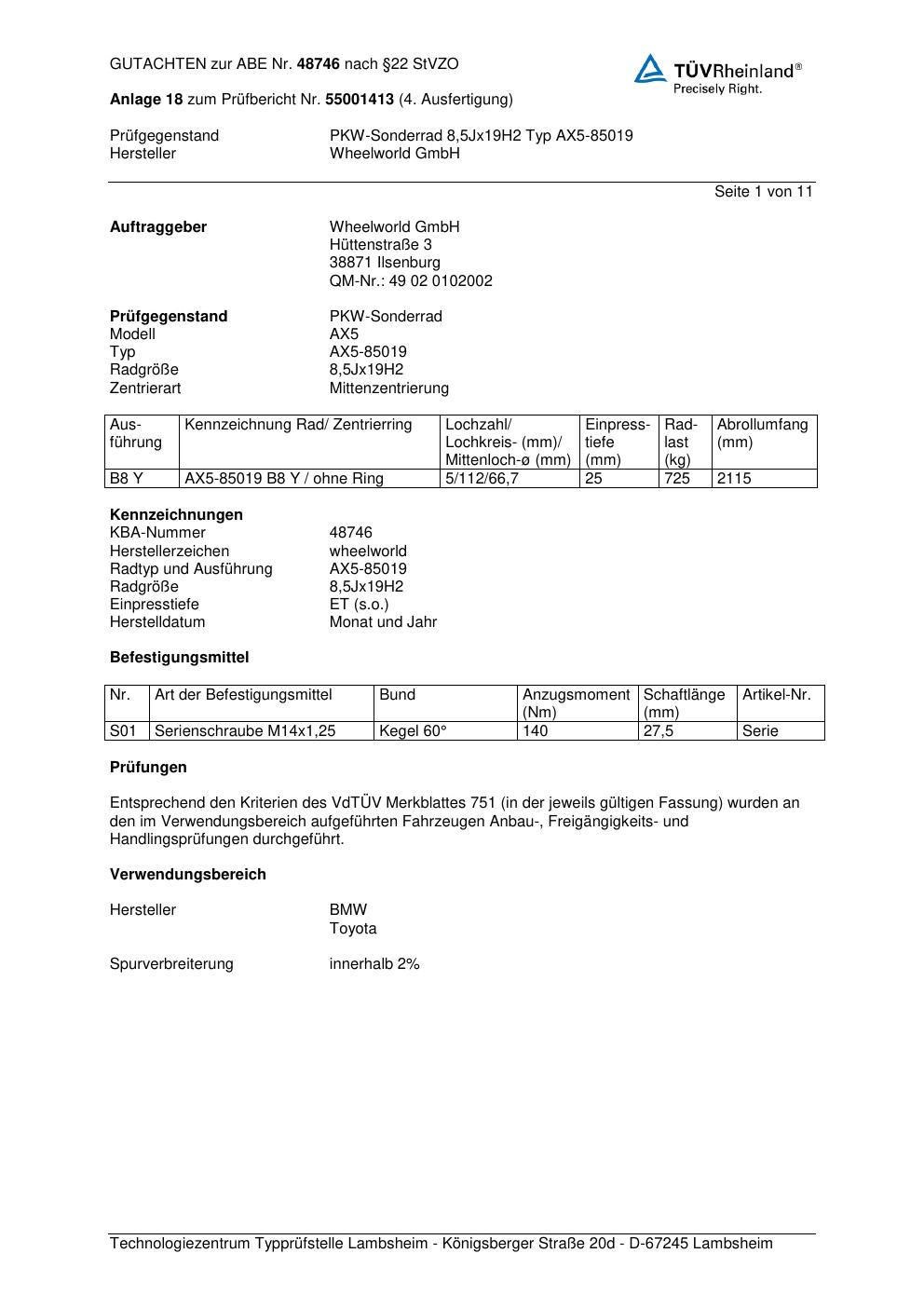 Dieses Gutachten (abe) bezieht sich auf die Alufelge Wheelworld GmbH AX5-85019 in der Ausführung ET 0, Mittenloch 0 mm (KBA 48746). Im PDF findest du typischerweise zulässige Reifengrößen, Auflagen/Anbauhinweise und – je nach Dokument – Hinweise zur Eintragung.