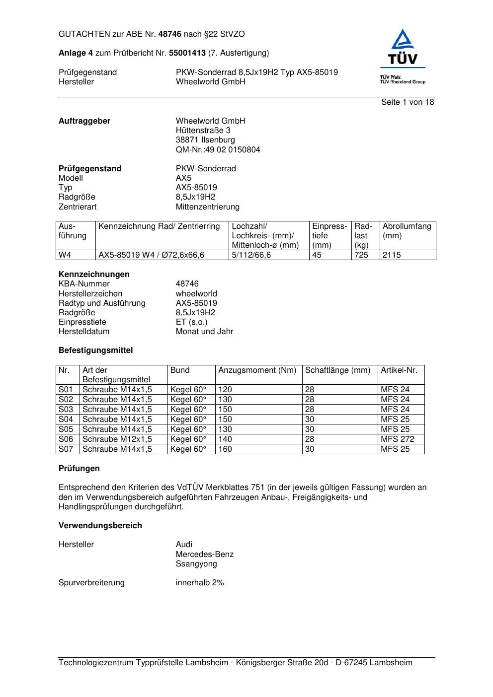 Dieses Gutachten (abe) bezieht sich auf die Alufelge Wheelworld GmbH AX5-85019 in der Ausführung ET 0, Mittenloch 0 mm (KBA 48746). Im PDF findest du typischerweise zulässige Reifengrößen, Auflagen/Anbauhinweise und – je nach Dokument – Hinweise zur Eintragung.