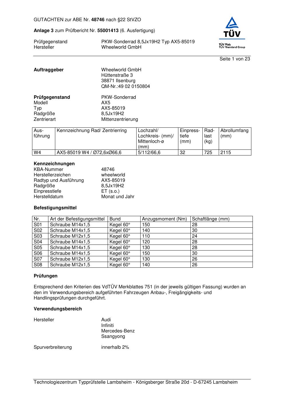Dieses Gutachten (abe) bezieht sich auf die Alufelge Wheelworld GmbH AX5-85019 in der Ausführung ET 0, Mittenloch 0 mm (KBA 48746). Im PDF findest du typischerweise zulässige Reifengrößen, Auflagen/Anbauhinweise und – je nach Dokument – Hinweise zur Eintragung.