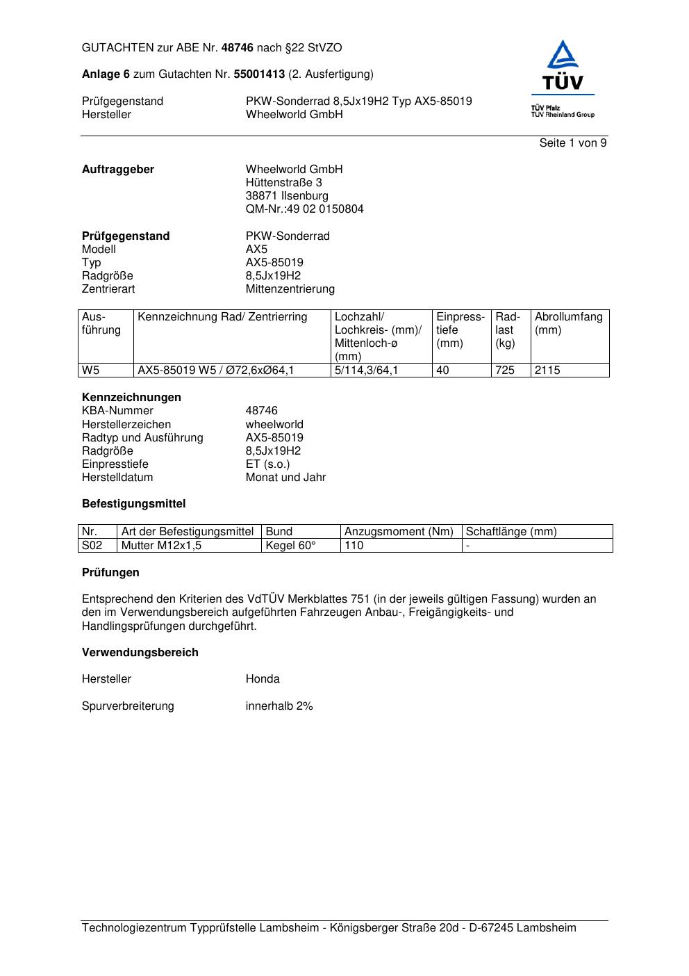 Dieses Gutachten (abe) bezieht sich auf die Alufelge Wheelworld GmbH AX5-85019 in der Ausführung ET 0, Mittenloch 0 mm (KBA 48746). Im PDF findest du typischerweise zulässige Reifengrößen, Auflagen/Anbauhinweise und – je nach Dokument – Hinweise zur Eintragung.