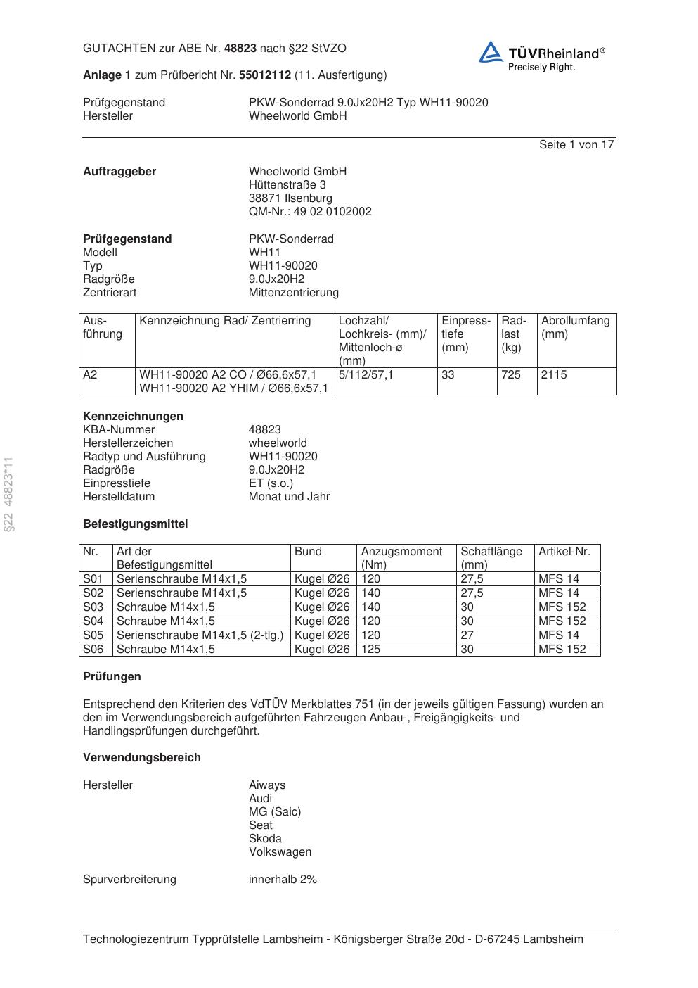 Dieses Gutachten (abe) bezieht sich auf die Alufelge Wheelworld WH11-90020 in der Ausführung ET 0, Mittenloch 0 mm (KBA 48823). Im PDF findest du typischerweise zulässige Reifengrößen, Auflagen/Anbauhinweise und – je nach Dokument – Hinweise zur Eintragung.