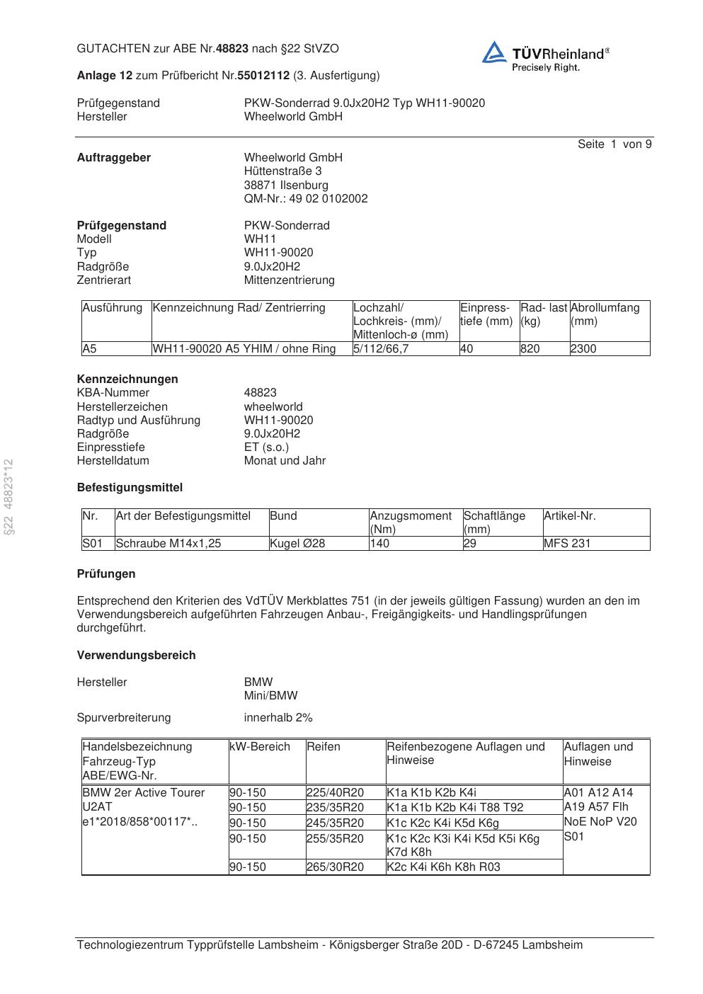 Dieses Gutachten (abe) bezieht sich auf die Alufelge Wheelworld WH11-90020 in der Ausführung ET 0, Mittenloch 0 mm (KBA 48823). Im PDF findest du typischerweise zulässige Reifengrößen, Auflagen/Anbauhinweise und – je nach Dokument – Hinweise zur Eintragung.