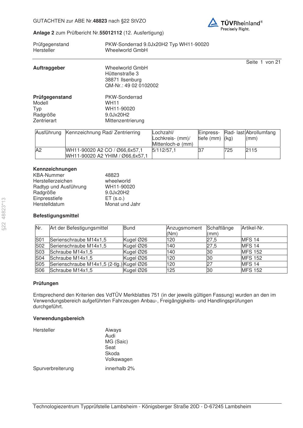 Dieses Gutachten (abe) bezieht sich auf die Alufelge Wheelworld WH11-90020 in der Ausführung ET 0, Mittenloch 0 mm (KBA 48823). Im PDF findest du typischerweise zulässige Reifengrößen, Auflagen/Anbauhinweise und – je nach Dokument – Hinweise zur Eintragung.