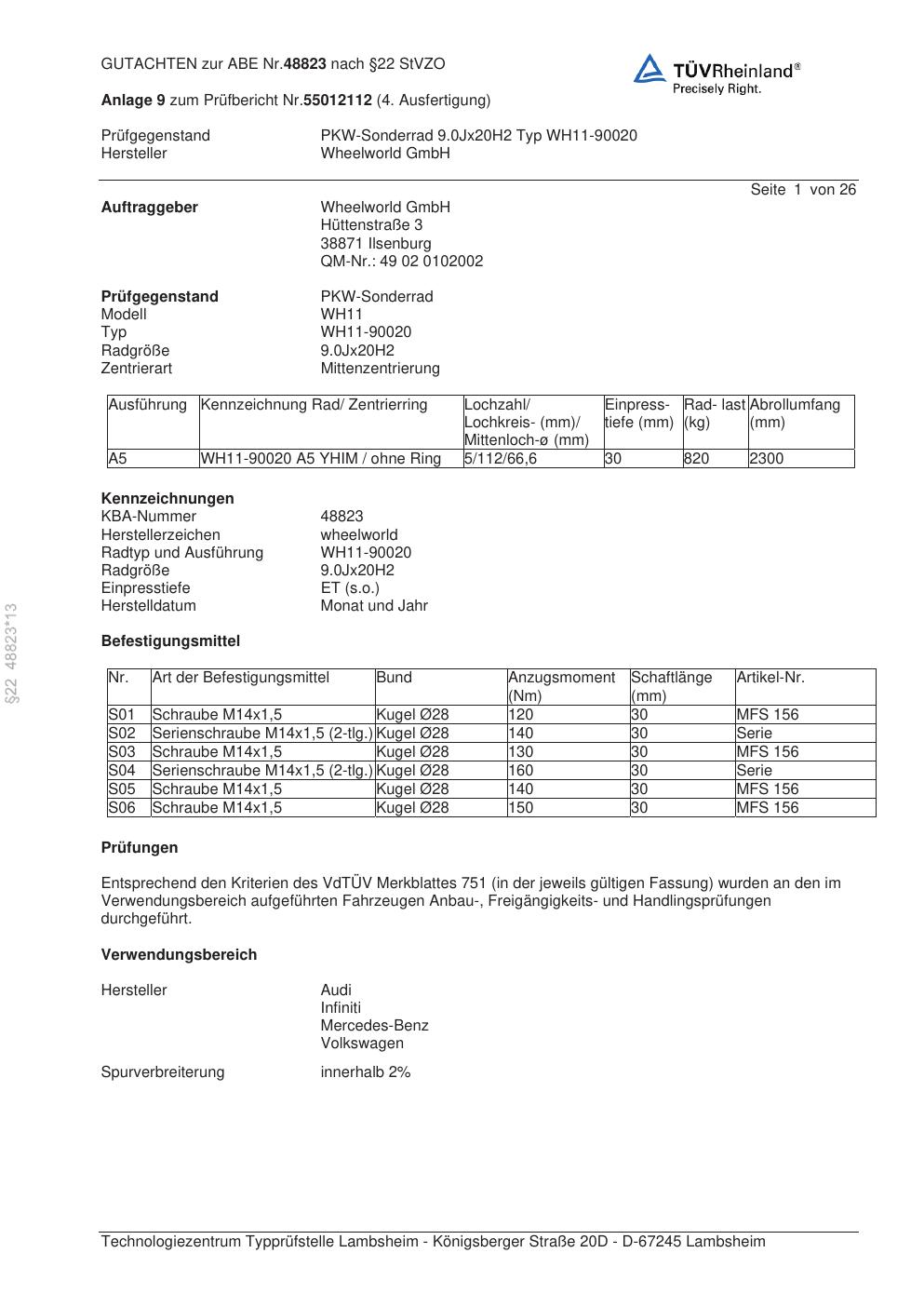 Dieses Gutachten (abe) bezieht sich auf die Alufelge Wheelworld WH11-90020 in der Ausführung ET 0, Mittenloch 0 mm (KBA 48823). Im PDF findest du typischerweise zulässige Reifengrößen, Auflagen/Anbauhinweise und – je nach Dokument – Hinweise zur Eintragung.