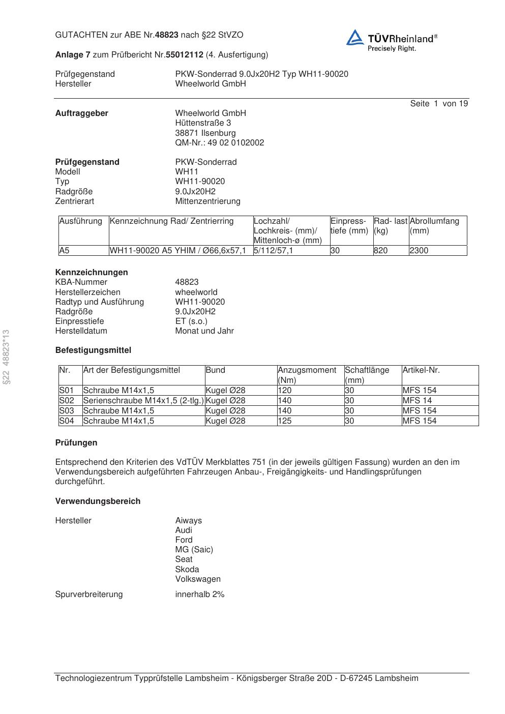 Dieses Gutachten (abe) bezieht sich auf die Alufelge Wheelworld GmbH WH11-90020 in der Ausführung ET 0, Mittenloch 0 mm (KBA 48823). Im PDF findest du typischerweise zulässige Reifengrößen, Auflagen/Anbauhinweise und – je nach Dokument – Hinweise zur Eintragung.
