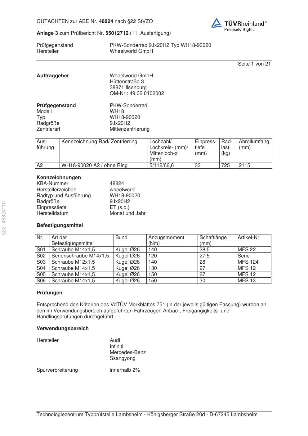 Dieses Gutachten (abe) bezieht sich auf die Alufelge Wheelworld WH18-90020 in der Ausführung ET 0, Mittenloch 0 mm (KBA 48824). Im PDF findest du typischerweise zulässige Reifengrößen, Auflagen/Anbauhinweise und – je nach Dokument – Hinweise zur Eintragung.