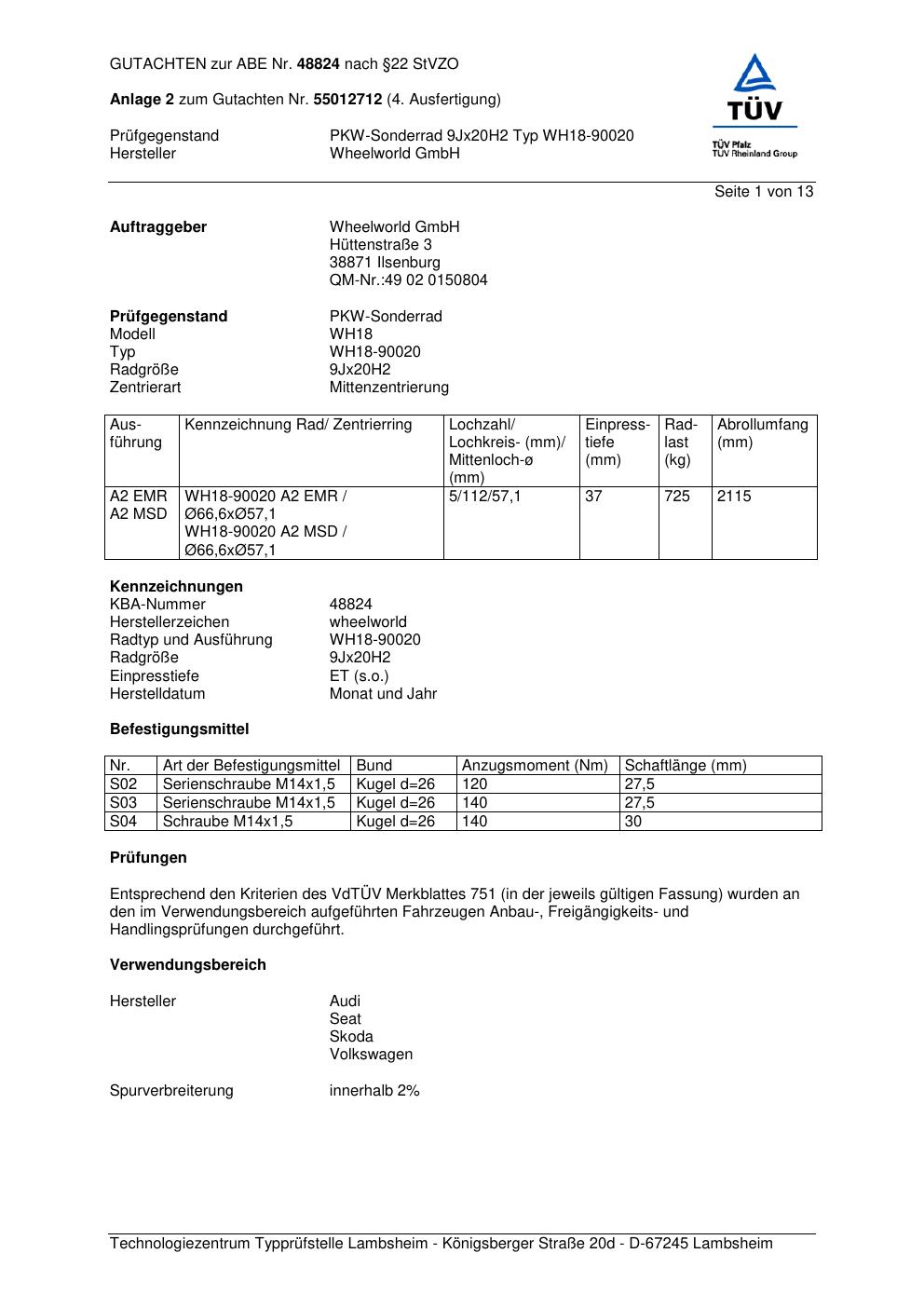 Dieses Gutachten (abe) bezieht sich auf die Alufelge Wheelworld WH18-90020 in der Ausführung ET 0, Mittenloch 0 mm (KBA 48824). Im PDF findest du typischerweise zulässige Reifengrößen, Auflagen/Anbauhinweise und – je nach Dokument – Hinweise zur Eintragung.
