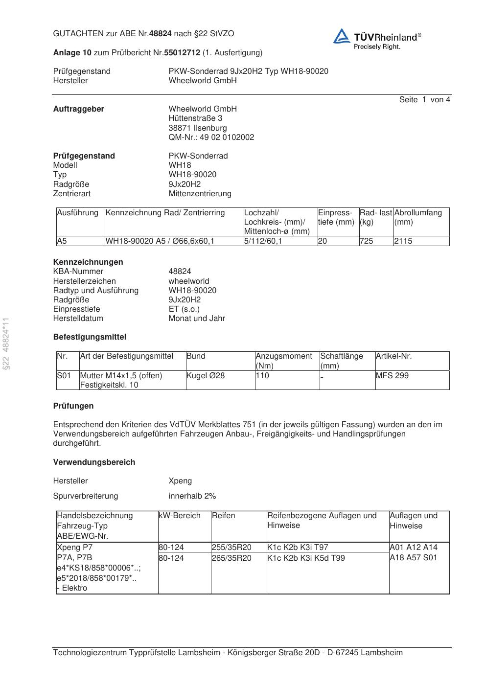 Dieses Gutachten (abe) bezieht sich auf die Alufelge Wheelworld WH18-90020 in der Ausführung ET 0, Mittenloch 0 mm (KBA 48824). Im PDF findest du typischerweise zulässige Reifengrößen, Auflagen/Anbauhinweise und – je nach Dokument – Hinweise zur Eintragung.