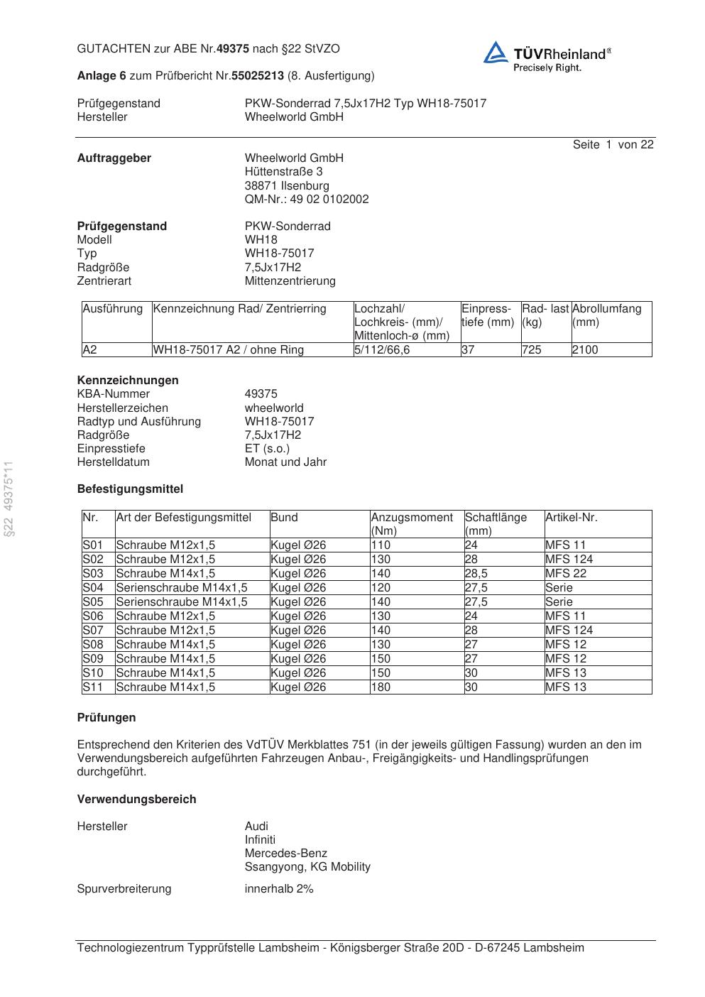 Dieses Gutachten (abe) bezieht sich auf die Alufelge Wheelworld GmbH WH18-75017 in der Ausführung ET 0, Mittenloch 0 mm (KBA 49375). Im PDF findest du typischerweise zulässige Reifengrößen, Auflagen/Anbauhinweise und – je nach Dokument – Hinweise zur Eintragung.