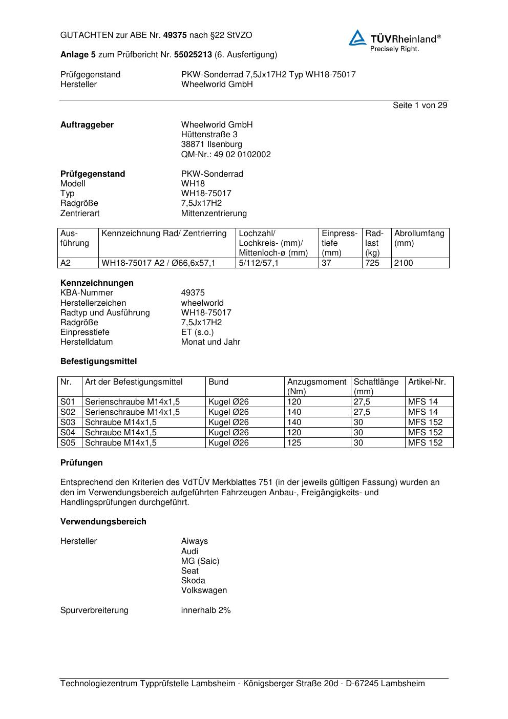 Dieses Gutachten (abe) bezieht sich auf die Alufelge Wheelworld GmbH WH18-75017 in der Ausführung ET 0, Mittenloch 0 mm (KBA 49375). Im PDF findest du typischerweise zulässige Reifengrößen, Auflagen/Anbauhinweise und – je nach Dokument – Hinweise zur Eintragung.