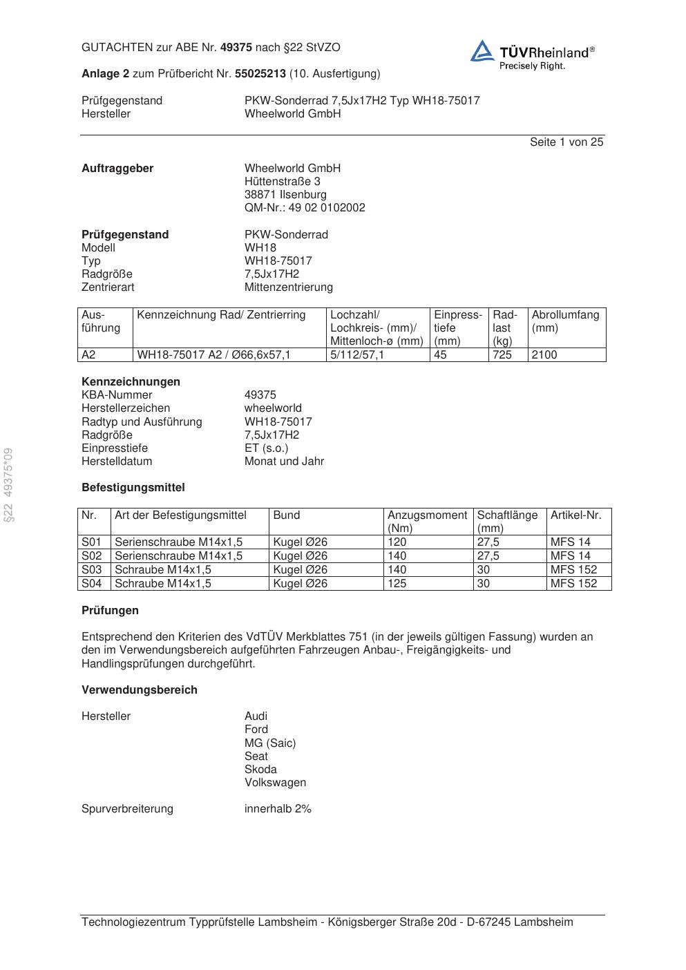 Dieses Gutachten (abe) bezieht sich auf die Alufelge Wheelworld GmbH WH18-75017 in der Ausführung ET 0, Mittenloch 0 mm (KBA 49375). Im PDF findest du typischerweise zulässige Reifengrößen, Auflagen/Anbauhinweise und – je nach Dokument – Hinweise zur Eintragung.