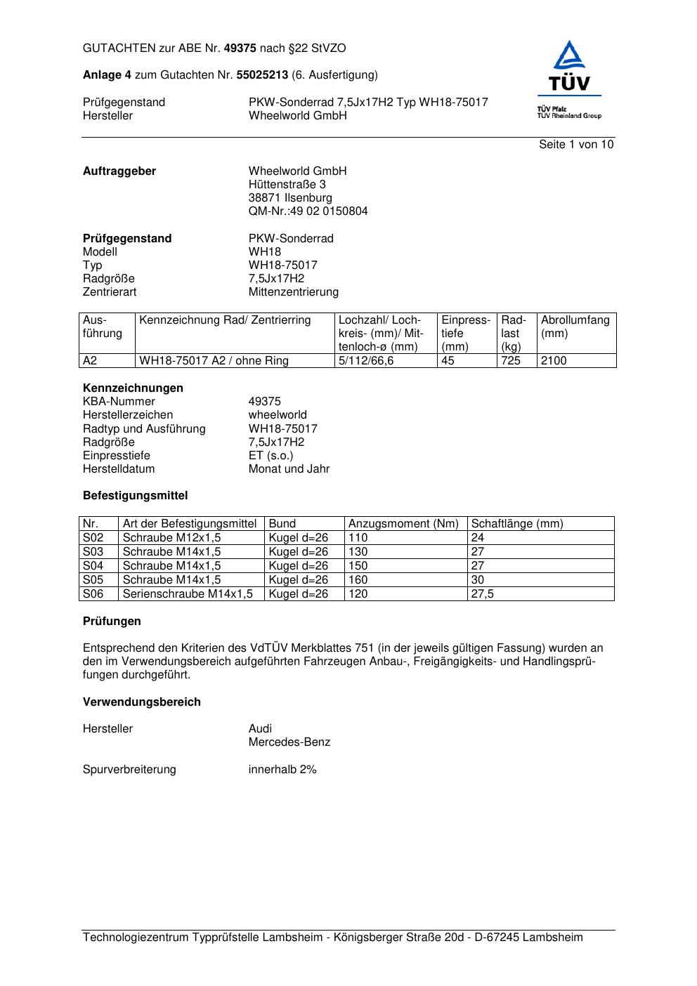 Dieses Gutachten (abe) bezieht sich auf die Alufelge Wheelworld GmbH WH18-75017 in der Ausführung ET 0, Mittenloch 0 mm (KBA 49375). Im PDF findest du typischerweise zulässige Reifengrößen, Auflagen/Anbauhinweise und – je nach Dokument – Hinweise zur Eintragung.