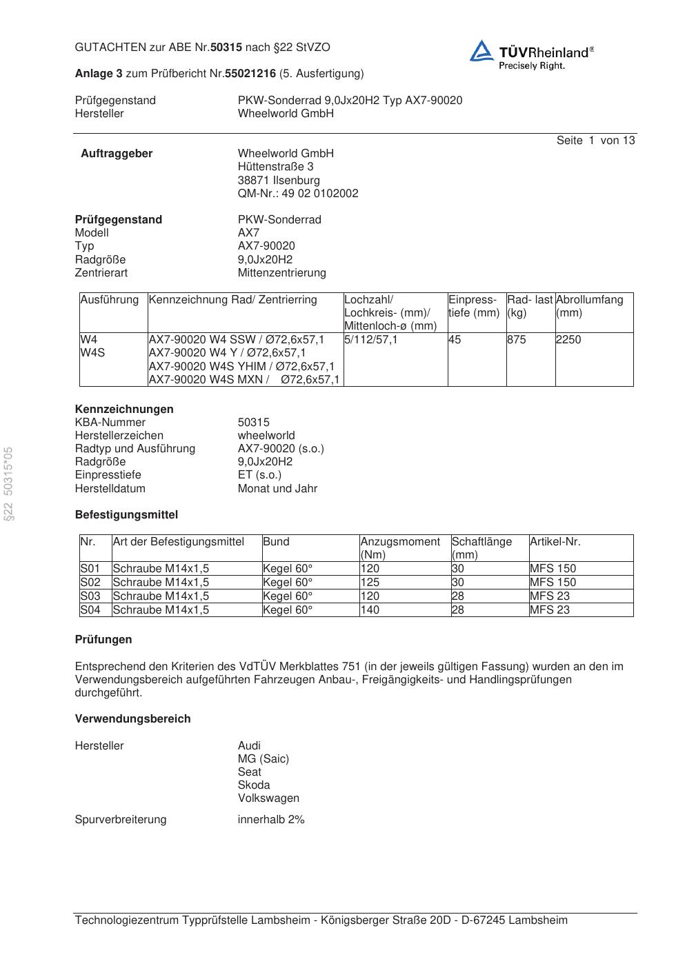 Dieses abe gehört zur Felge Wheelworld AX7-90020 in ET0 mit KBA 50315. Die Seite ist dafür gedacht, dass du schnell prüfen kannst, ob KBA, Design und Größe zu deiner Felge passen und danach direkt das richtige PDF lädst.