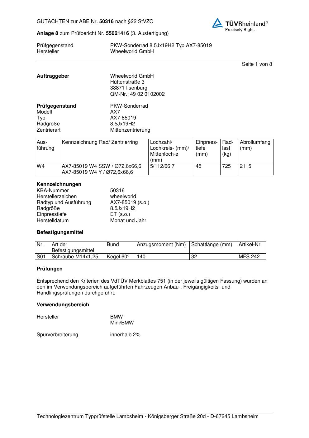 Dieses Gutachten (abe) bezieht sich auf die Alufelge Wheelworld AX7-85019 in der Ausführung ET 0, Mittenloch 0 mm (KBA 50316). Im PDF findest du typischerweise zulässige Reifengrößen, Auflagen/Anbauhinweise und – je nach Dokument – Hinweise zur Eintragung.