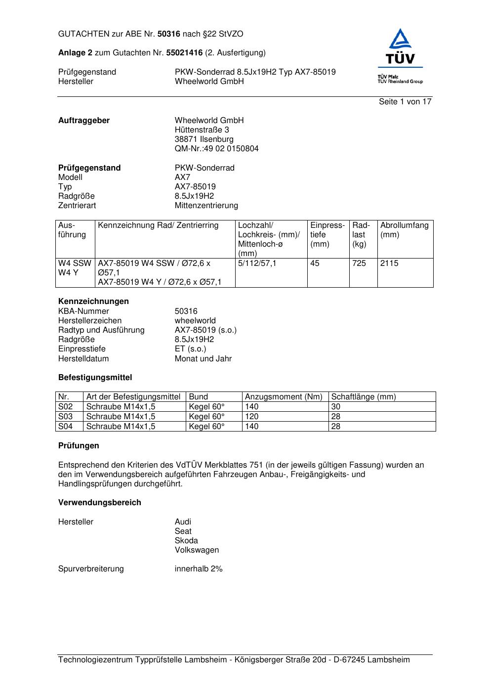 Dieses Gutachten (abe) bezieht sich auf die Alufelge Wheelworld AX7-85019 in der Ausführung ET 0, Mittenloch 0 mm (KBA 50316). Im PDF findest du typischerweise zulässige Reifengrößen, Auflagen/Anbauhinweise und – je nach Dokument – Hinweise zur Eintragung.