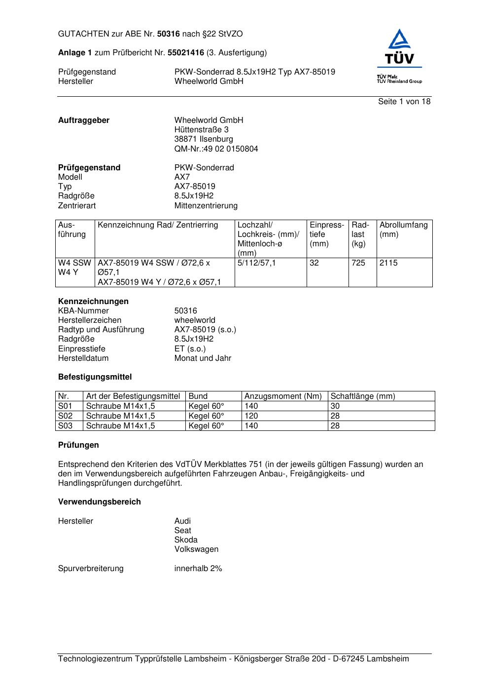 Dieses Gutachten (abe) bezieht sich auf die Alufelge Wheelworld AX7-85019 in der Ausführung ET 0, Mittenloch 0 mm (KBA 50316). Im PDF findest du typischerweise zulässige Reifengrößen, Auflagen/Anbauhinweise und – je nach Dokument – Hinweise zur Eintragung.