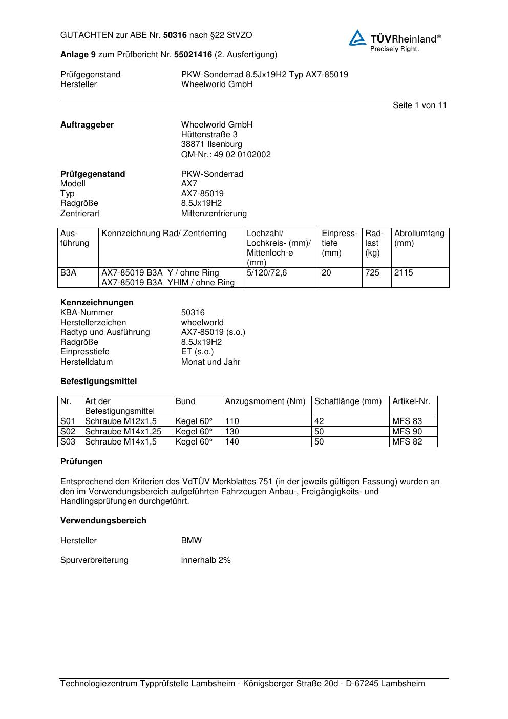Dieses Gutachten (abe) bezieht sich auf die Alufelge Wheelworld AX7-85019 in der Ausführung ET 0, Mittenloch 0 mm (KBA 50316). Im PDF findest du typischerweise zulässige Reifengrößen, Auflagen/Anbauhinweise und – je nach Dokument – Hinweise zur Eintragung.