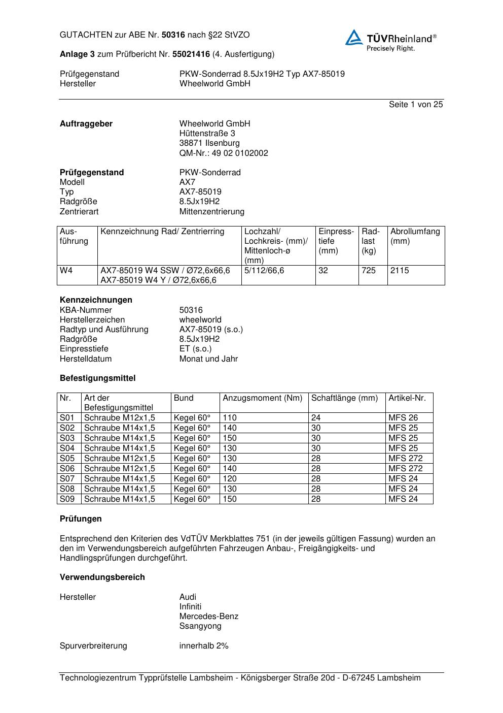 Felgengutachten / abe für Alufelgen Wheelworld AX7-85019 (ET 0, Mittenloch 0 mm) mit KBA 50316 (Zertifikatsnummer 50316). Hier kostenlos als PDF herunterladen. Der Download-Link ist 24 Stunden gültig und kann bis zu zwei Mal verwendet werden.
