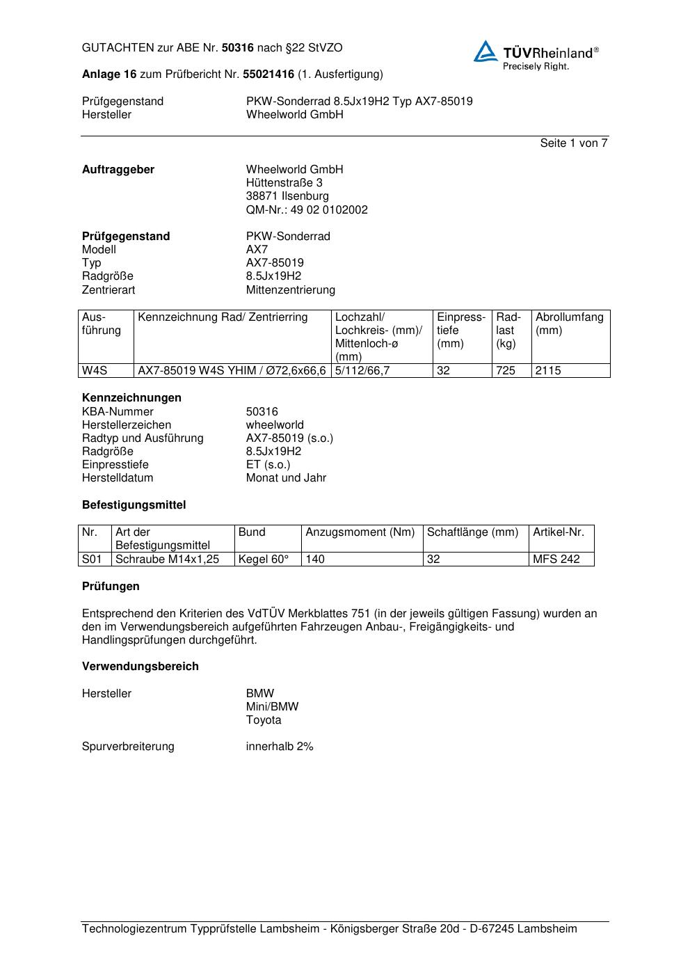 Dieses Gutachten (abe) bezieht sich auf die Alufelge Wheelworld AX7-85019 in der Ausführung ET 0, Mittenloch 0 mm (KBA 50316). Im PDF findest du typischerweise zulässige Reifengrößen, Auflagen/Anbauhinweise und – je nach Dokument – Hinweise zur Eintragung.