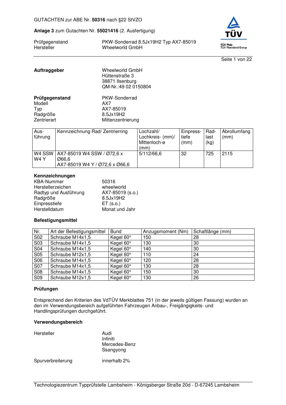 Dieses Gutachten (abe) bezieht sich auf die Alufelge Wheelworld AX7-85019 in der Ausführung ET 0, Mittenloch 0 mm (KBA 50316). Im PDF findest du typischerweise zulässige Reifengrößen, Auflagen/Anbauhinweise und – je nach Dokument – Hinweise zur Eintragung.